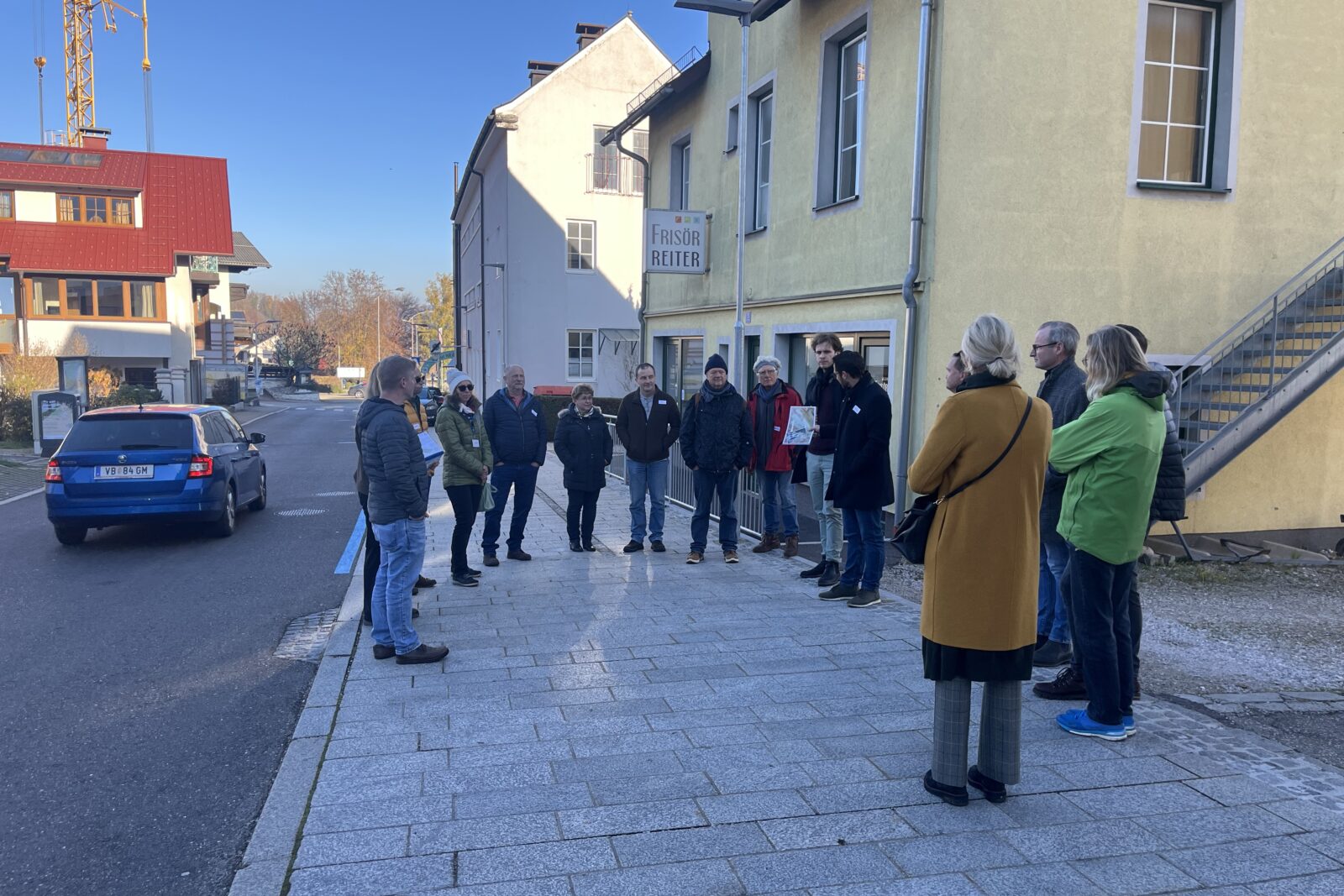 Am Samstag Nachmittag fanden sich zahlreiche Gemeindefunktionäre und Interessierte beim Gemeindeamt ein. Nach einer kurzen Begrüßung durch das Projektteam und den Altmünsterer Bürgermeister Martin Pelzer startete der 2-stündige Spaziergang durch den Ort. Bei insgesamt fünf Stationen wurde Halt gemacht und lokales Wissen mit wissenschaftlichen Erkenntnissen verknüpft. Im Zentrum standen die qualitätsvolle, sozial gerechte und klimafreundliche Bodennutzung sowie spezifische Herausforderungen in einer Gemeinde wie Altmünster, beispielsweise im Ortskern oder rund um Klimawandelanpassung.